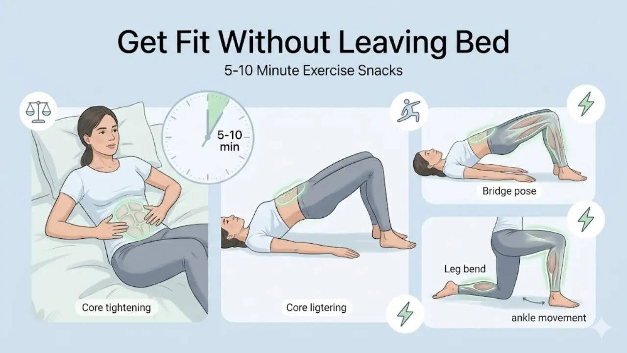 At a time when most people follow a sedentary lifestyle, exercise is nothing short of medicine. However, for someone who is lazy, workouts can take a good deal of effort — but what if we told you that there are some simple exercises that will not take much of your time and can be done easily while lying flat on your back? According to experts, without having to lift a finger, you can get in shape.Best workouts to do in bedResearchers at Teikyo University in Tokyo, Japan, found that people can improve their agility, balance, and flexibility by engaging in a simple exercise programme that involves three exercises. These exercises engage the leg muscles and core in an easy and safe position. Writing in the journal PLOS One, the study authors compared the routine to Pilates, and experts said that it can help prevent falls and support early rehabilitation.Adults are recommended to do two and a half hours of exercise each week, but about a third of people do not meet this target. In this study, 39 healthy men and women in their 20s, with optimal flexibility, balance, speed, and strength, were involved. They were all tested before and after a two-week regimen of lying down and working out. The exercises they were asked to perform were:Tense the abs for five seconds while pressing them with the fingers—repeat three timesLifting the hips off the ground to form a bridge pose, keeping the feet flat on the ground—hold for five seconds and repeat 10 timesBending one leg at the knee and holding the ankle at 90 degrees, clenching and unclenching the toes; ensure that the heel slides along the floor towards and away from the body—repeat three times with each legFifteen days later, participants showed significant improvement in standing balance, flexibility, and agility. However, they did not show improvement in raw muscle strength, jumping ability, or grip strength tests. Scientists said that these improvements were likely due to better muscle control rather than increased muscle mass. They also noted that no prior research has shown an exercise programme that is short and performed in a supine position to be effective in this way. However, this routine, which showed improvements in flexibility, agility, balance, and stability, shows promise. It could also be helpful for rehabilitation in older adults.What is exercise snacking?Exercise snacking refers to an approach created for people who struggle to find time for long gym sessions. Instead of spending hours at the gym, people can perform small bursts of exercise throughout the day. These sessions are an effective way to stay active without needing to block out time specifically for fitness. They can be spread across the day, with mini workouts lasting five to 10 minutes and repeated multiple times. The benefits are significant when practised consistently, especially for those with desk jobs or those suffering from diabetes, hypertension, high cholesterol, or even depression.