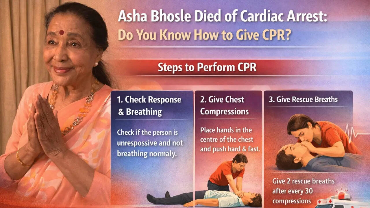 Asha Bhosle, India's veteran singer, died of cardiac arrest on Sunday. On Saturday evening, the 92-year-old was admitted to Mumbai's Breach Candy Hospital. Initially, she was admitted due to a chest infection but was later moved to the ICU the same night. The news of her hospitalisation was confirmed by her singer granddaughter Zanai Bhosle, citing 'extreme exhaustion and chest infection'."My grandmother, Asha Bhosle, due to extreme exhaustion and suffering a chest infection, has been admitted to hospital and we request you to value our privacy. Treatment is ongoing and hopefully everything will be well and we shall update you positively," Zanai wrote.What is cardiac arrest?A cardiac arrest is a medical emergency that requires immediate attention. It is characterised by a sudden halt in heart function – it stops beating and blood circulation to the brain and organs is consequently cut off. It is characterised by unresponsiveness, sudden collapse, and lack of breathing. As opposed to a heart attack, a cardiac arrest is an electrical failure caused by conditions like arrhythmia. The symptoms can include palpitations, dizziness, shortness of breath, and sudden collapse. For treatment, or as a life-saving measure, CPR must be performed.What is CPR?Cardiopulmonary Resuscitation (CPR) is an emergency procedure for patients who suffer a cardiac arrest. It combines chest compressions and rescue breathing to ensure oxygen flow to the organs. It is an effort to resuscitate a patient, and performing it immediately can double or even triple the chances of survival.How to perform CPR?To perform CPR on an adult, follow the given steps:Begin by checking if the collapsed patient is responsiveCheck if the patient is breathing or not, even if he or she is only gaspingLay the patient on the ground with their back on a firm, flat surfacePlace the heel of one of your hands on the centre of the chest and place the other hand on top of itStart delivering chest compressions – hard and fastPush at a rate of 100 to 120 compressions per minute and allow the chest to return to normalYou may combine 30 compressions with two rescue breaths until an ambulance arrives, or till the patient wakes upSimply performing this can double the odds of survival, which is why CPR training is a must for all. However, doctors say that if not trained in CPR, then only perform compressions.
